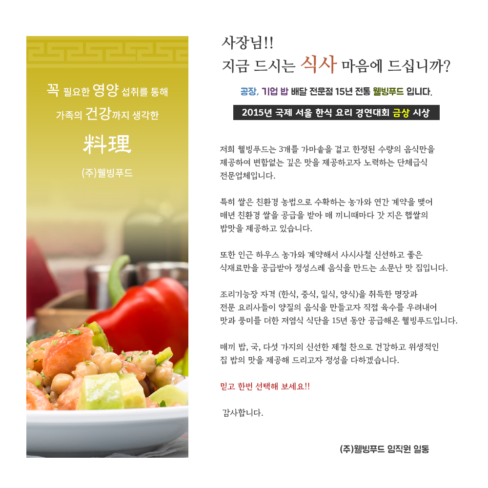 맛과 풍미를 더한 저염식 식단을 15년 동안 공급해온 웰빙푸드입니다.
