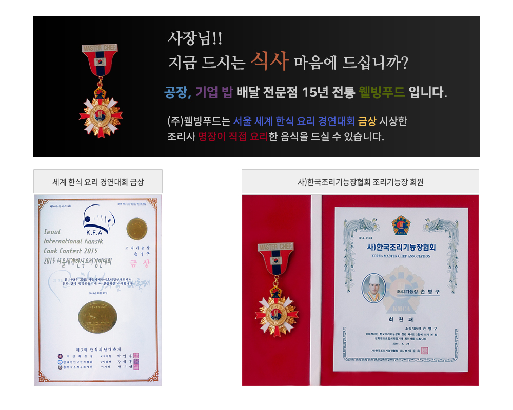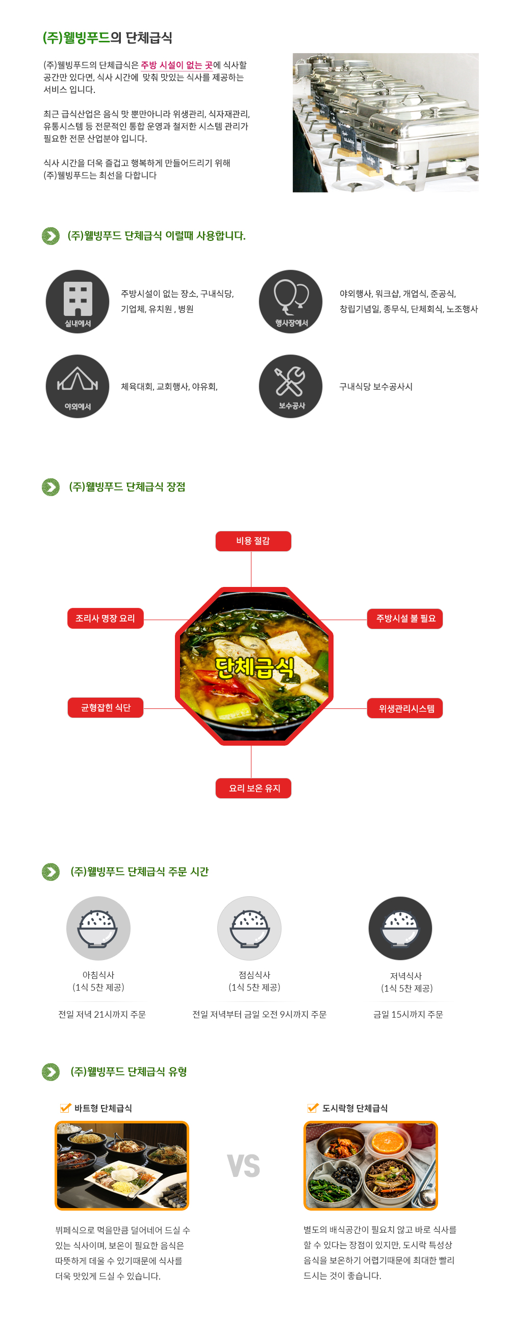 (주)웰빙푸드의 단체급식은 주방 시설이 없는 곳에 식사할 공간만 있다면, 식사 시간에 맞춰 맛있는 식사를 제공하는 서비스 입니다. 최근 급식산업은 음식 맛 뿐만아니라 위생관리, 식자재관리,유통시스템 등 전문적인 통합 운영과 철저한 시스템 관리가 필요한 전문 산업분야 입니다. 식사 시간을 더욱 즐겁고 행복하게 만들어드리기 위해 (주)웰빙푸드는 최선을 다합니다
