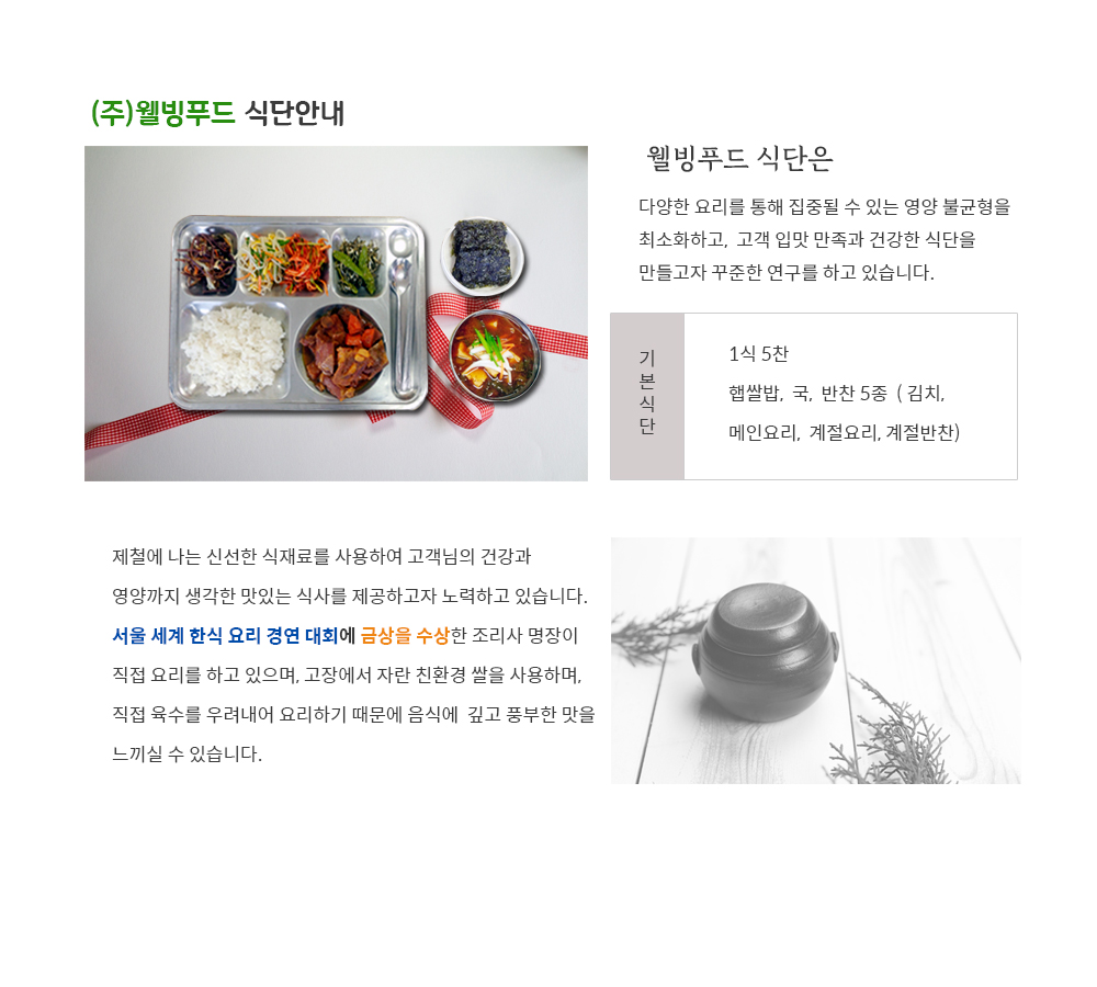 (주)웰빙푸드 식단은 다양한 요리를 통해 집중될 수 있는 영양 불균형을 최소화하고, 고객 입맛 만족과 건강한 식단을 만들고자 꾸준한 연구를 하고 있습니다.